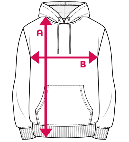 Um sicherzugehen, dass du die perfekte Kleidergröße findest, schnapp dir einen Hoodie, der dir bequem sitzt, und miss ihn aus. Orientiere dich dabei an der Abbildung und nimm die Maße für die Oberkörperlänge (A) und die Brustbreite (B). So bekommst du eine genaue Vorstellung davon, welche Größe dir am besten passt!
