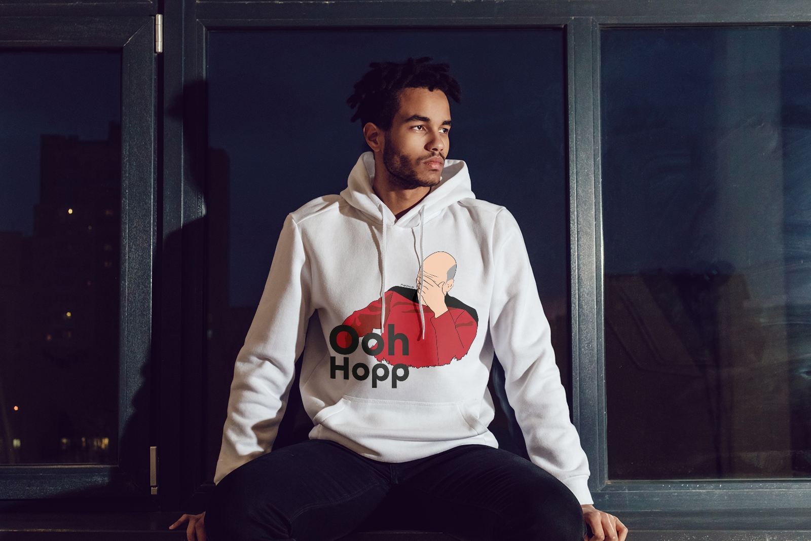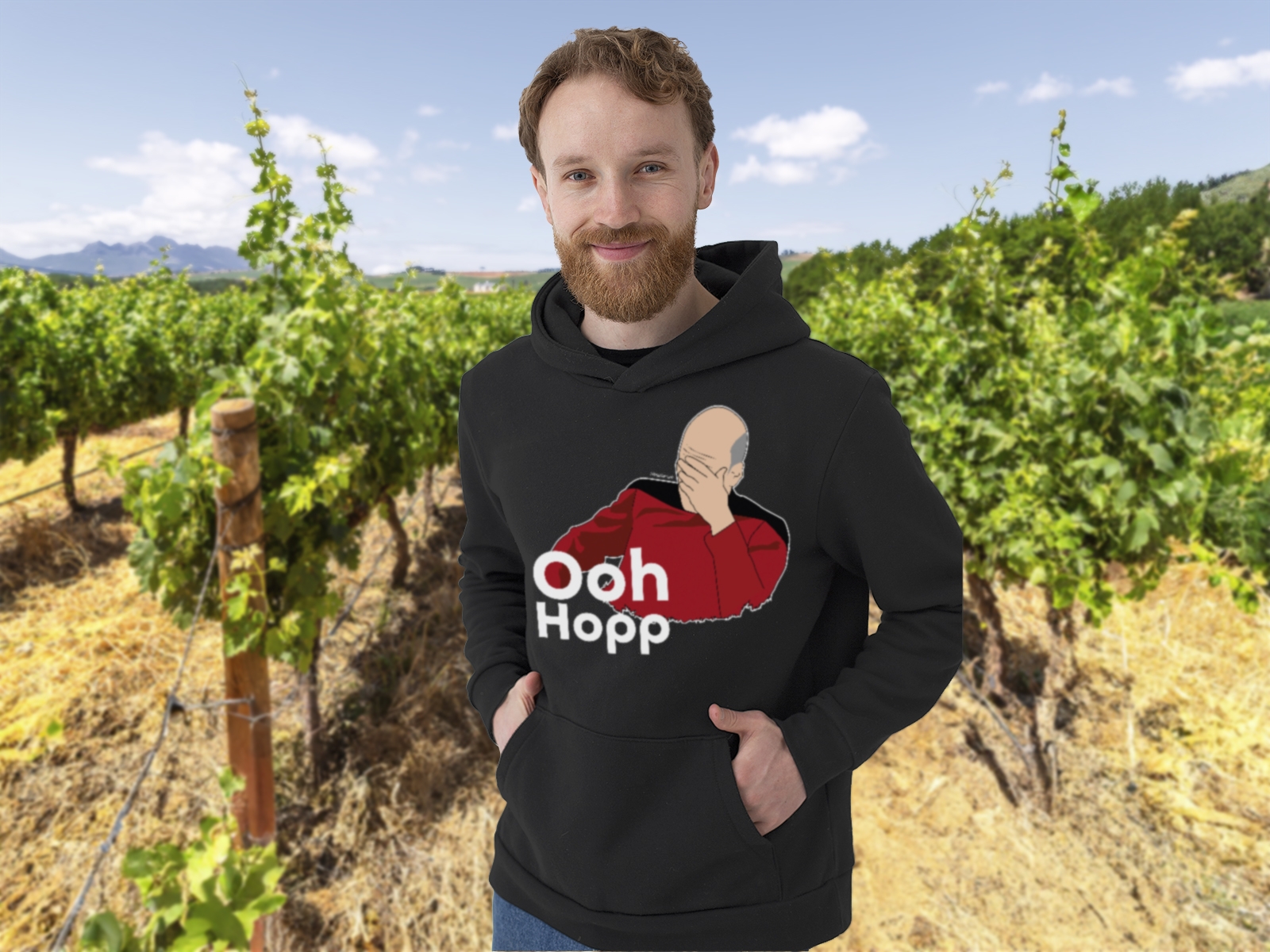 Star Trek Fan-Hoodie: Captain Picard "Ooh Hopp" mit berühmten Facepalm-Moment.