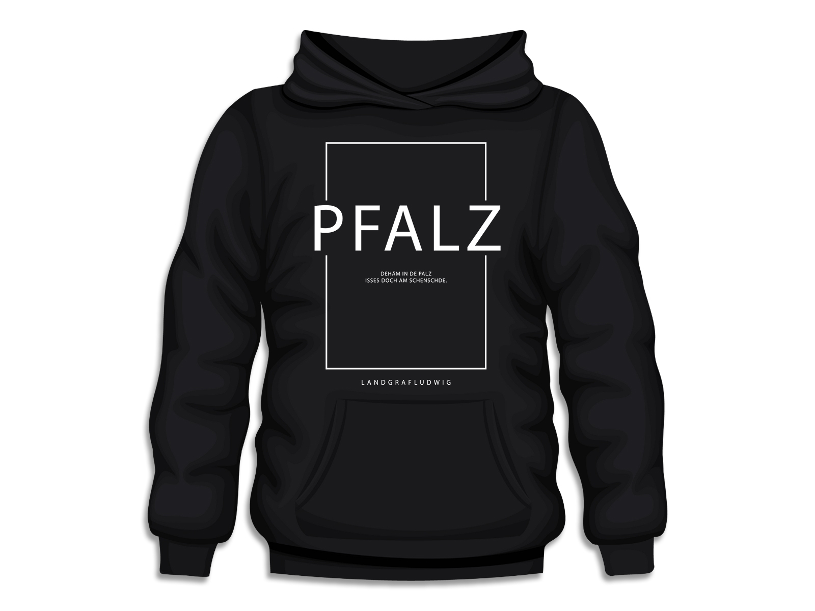 PFALZ - Dehäm in de Palz Damen Hoodie: Modern und stilvoll. "PFALZ" groß, "Dehäm in de Palz isses doch am schenschde" klein. In Schwarz und Weiß, Größe XS-XXL.